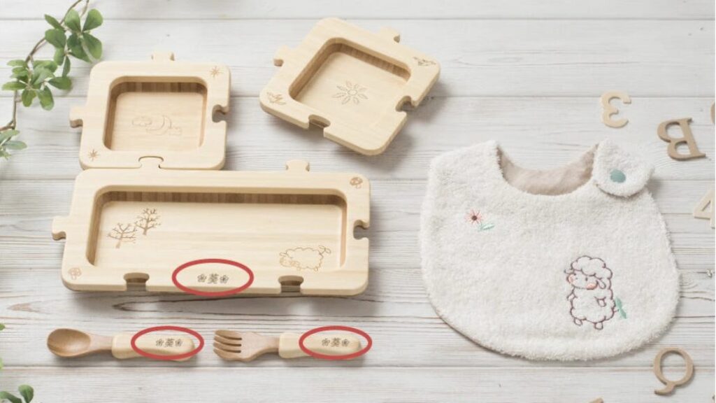 ジグソープレートにはお子さまのお名前を最大5文字まで刻印できる名入れサービス付き(スタイは対象外)。
