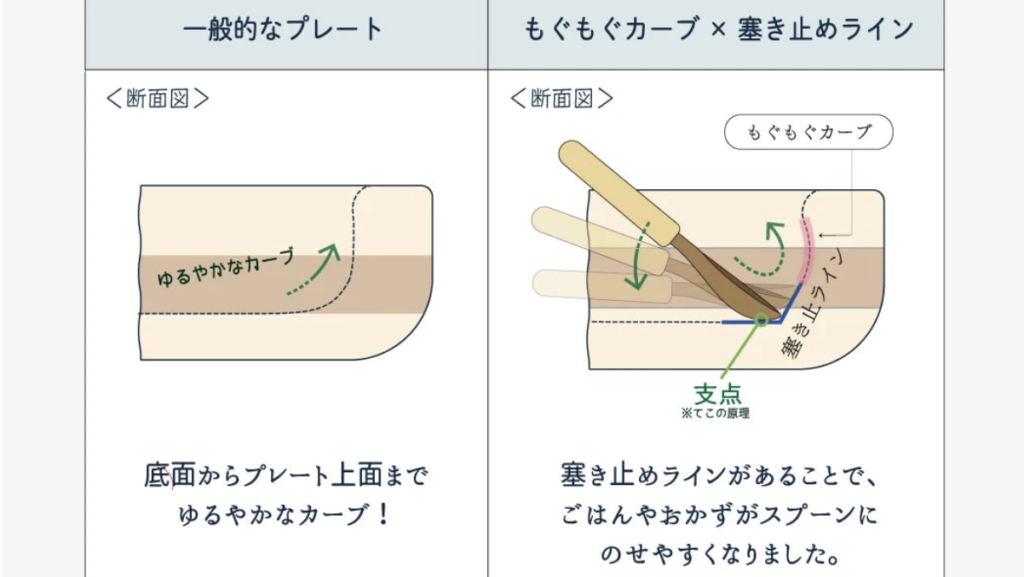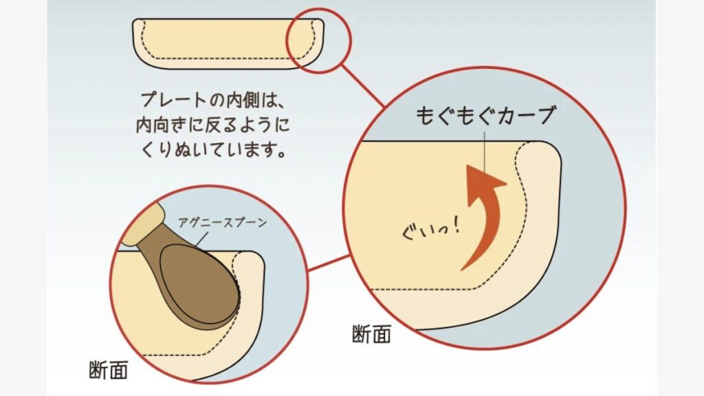 「もぐもぐカーブ」と「塞き止めライン」というアグニー独自の技術が施されており、スプーンで食べ物をすくいやすい設計。