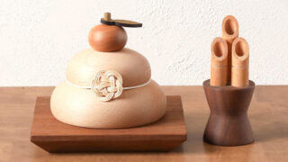 クムキ「色~いろ~ 正月飾り 鏡餅」は、無垢材を使ったサステナブルな木製鏡餅。梅結びの水引が縁起を添え、和室にも洋室にも馴染む上質デザイン。毎年飾れるモダンな正月飾りとして人気です。