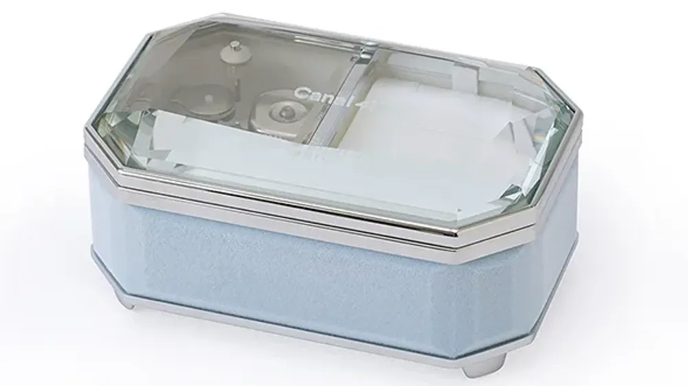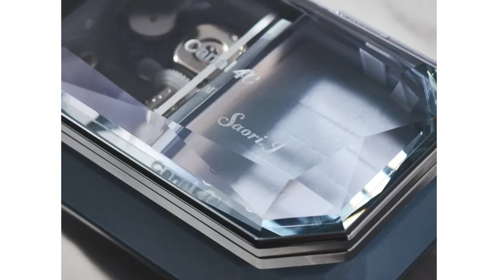 まず目を引くのが、天面にカットガラスをあしらったオルゴールケース。光が当たるたびにキラキラと輝き、まるで宝石箱のような存在感です。高級感のある質感ながら、どこか可憐でロマンティックな雰囲気をまとっています。