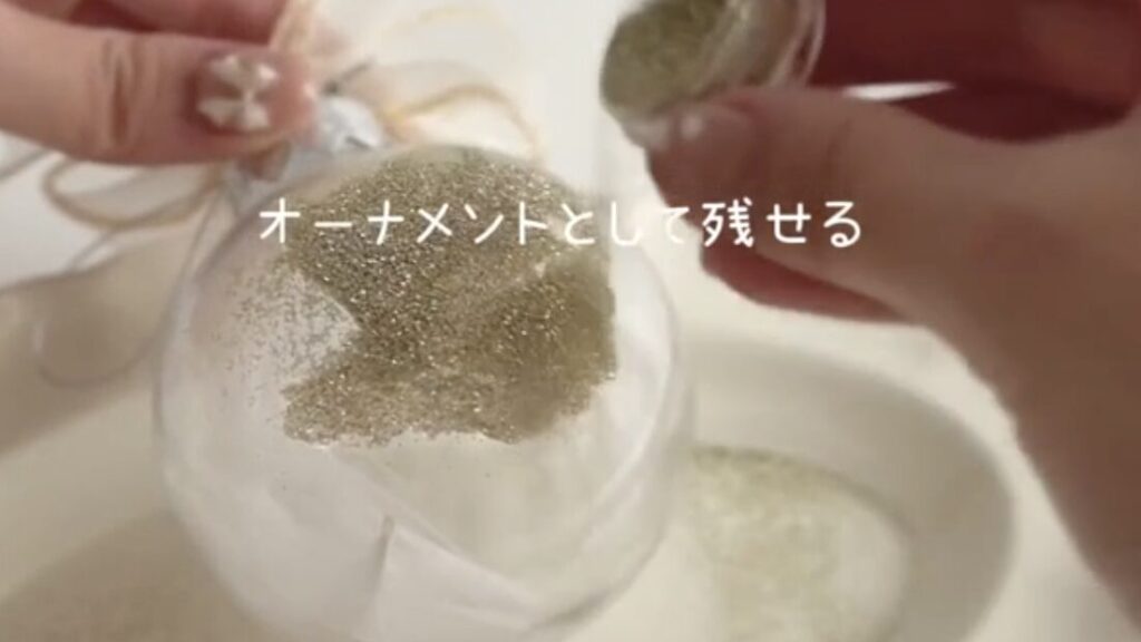 グリッターの光が当たるたびに優しく反射し、見るたびに幸せな気持ちを思い出させてくれます。