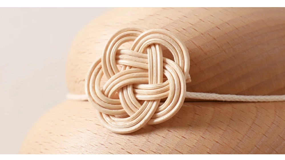鏡餅の上には、ラタン(籐)で手結いされた梅結びの水引が添えられています。