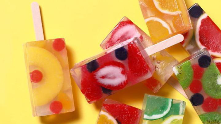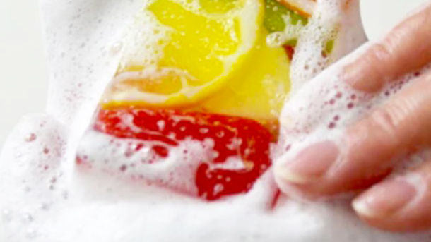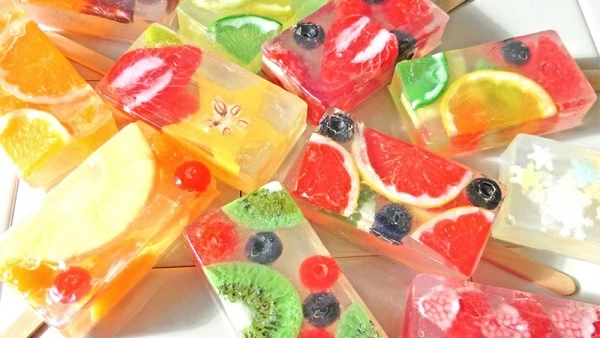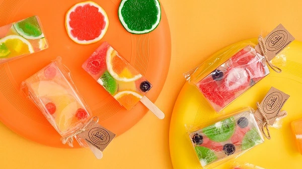 バーの中に閉じ込められた色とりどりのフルーツは、すべて石けん素材でできています。