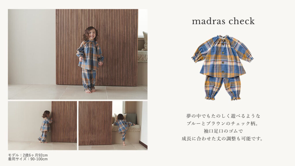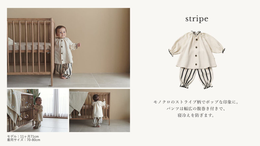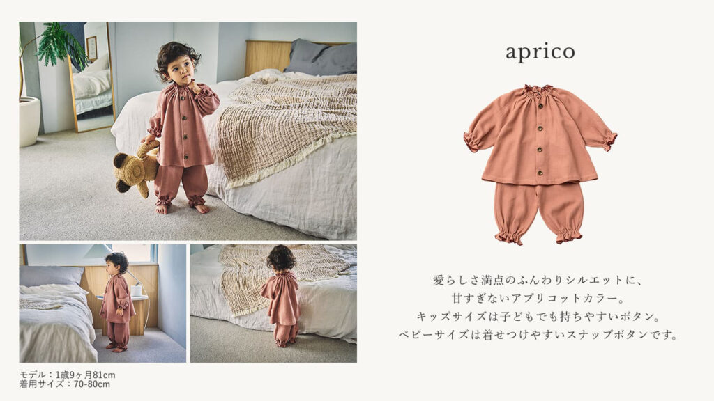 「今日はどのパジャマを着よう?」と、毎晩のルーティンがちょっと楽しみになるようなデザインです。