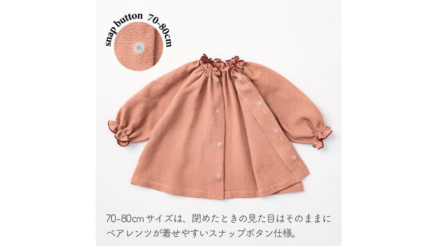 70〜80cmサイズは、見た目は同じまま隠しスナップボタン仕様。ママ・パパが着せやすく、寝かしつけ前の支度もスムーズです。