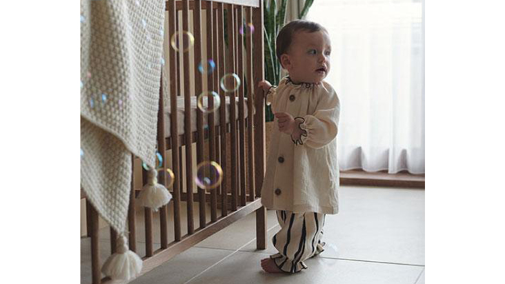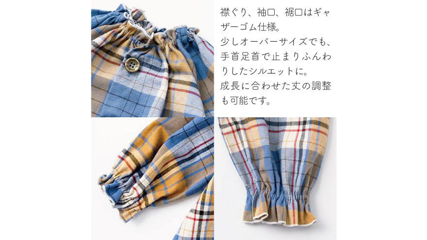 袖口と裾にはゴムが入っており、成長に合わせて丈を調整できるのも嬉しいポイント。長く着られるデザインなので、子どもの成長をやさしく見守るように寄り添ってくれます。
