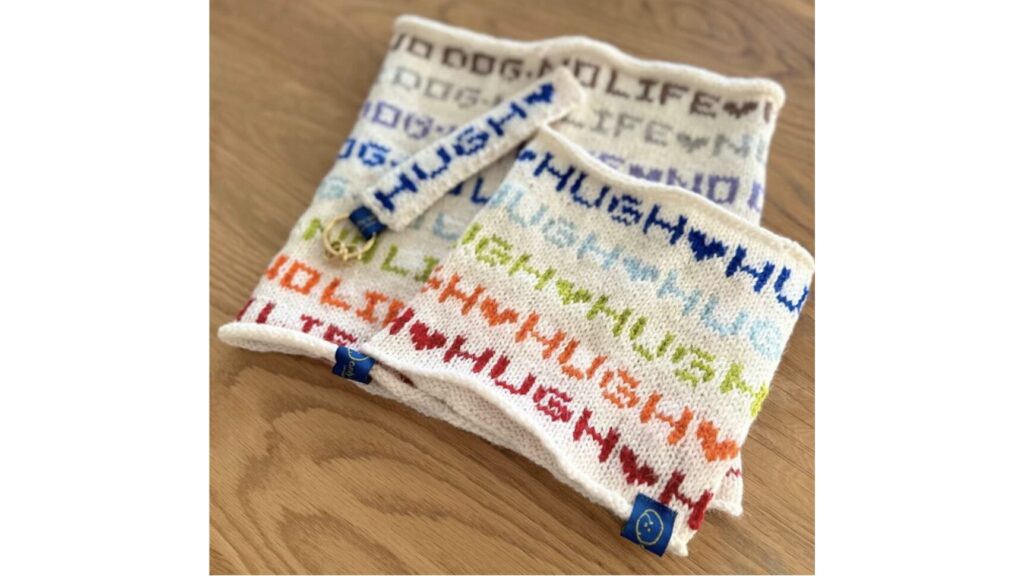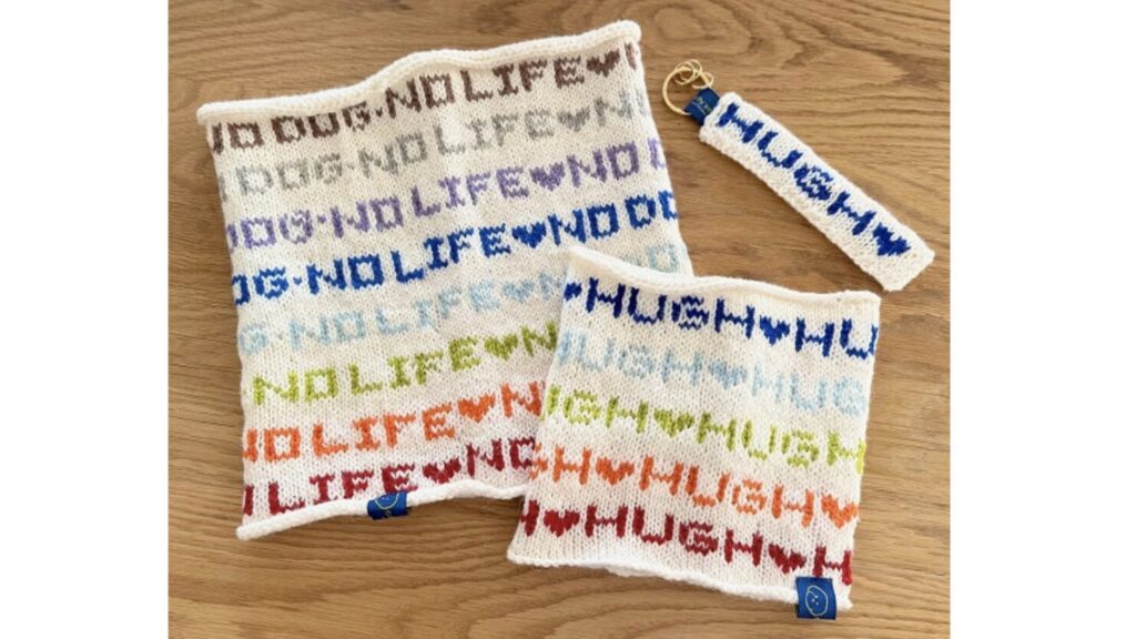 人用スヌードには「NO DOG • NO LIFE ❤️」のメッセージを編み込み。