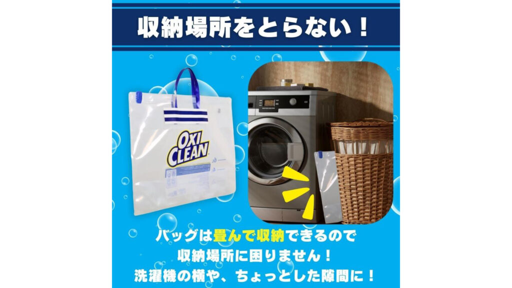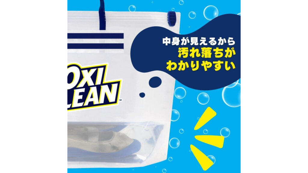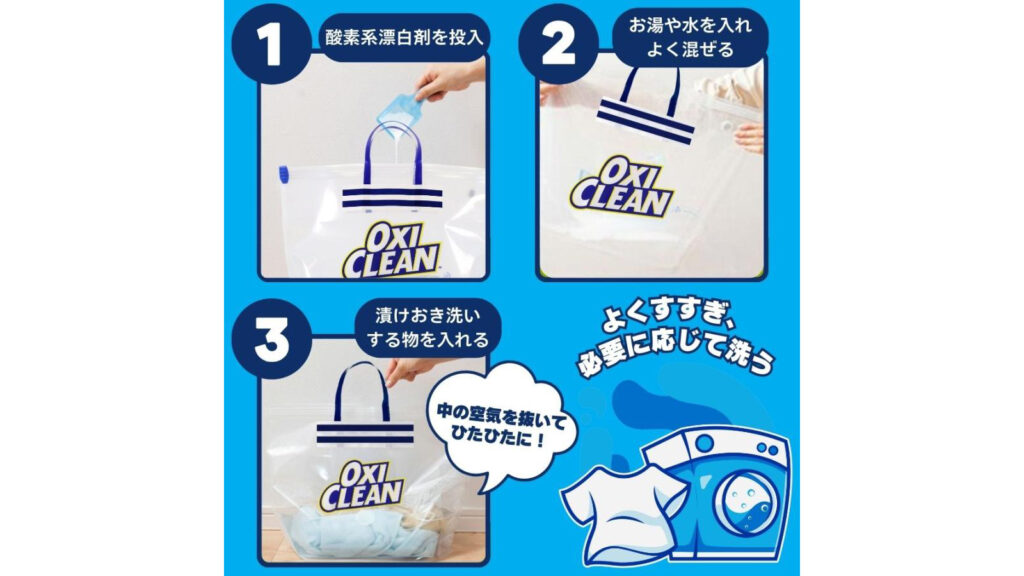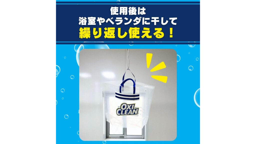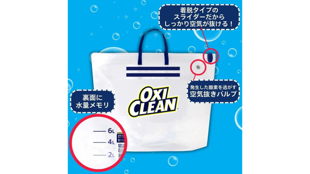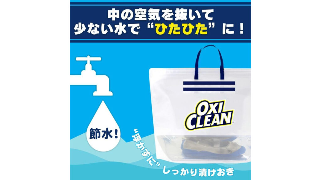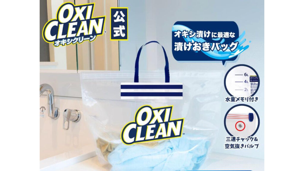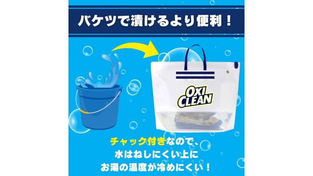 名前の通り、オキシ漬けにぴったりの専用バッグで、手軽に、清潔に、そして場所を取らずに漬け置き洗いができるアイテムです。