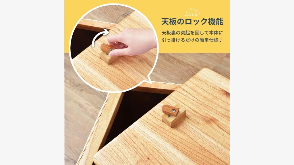 天板裏の突起を回すだけでしっかり固定されるため、座ったときにズレる心配がありません。