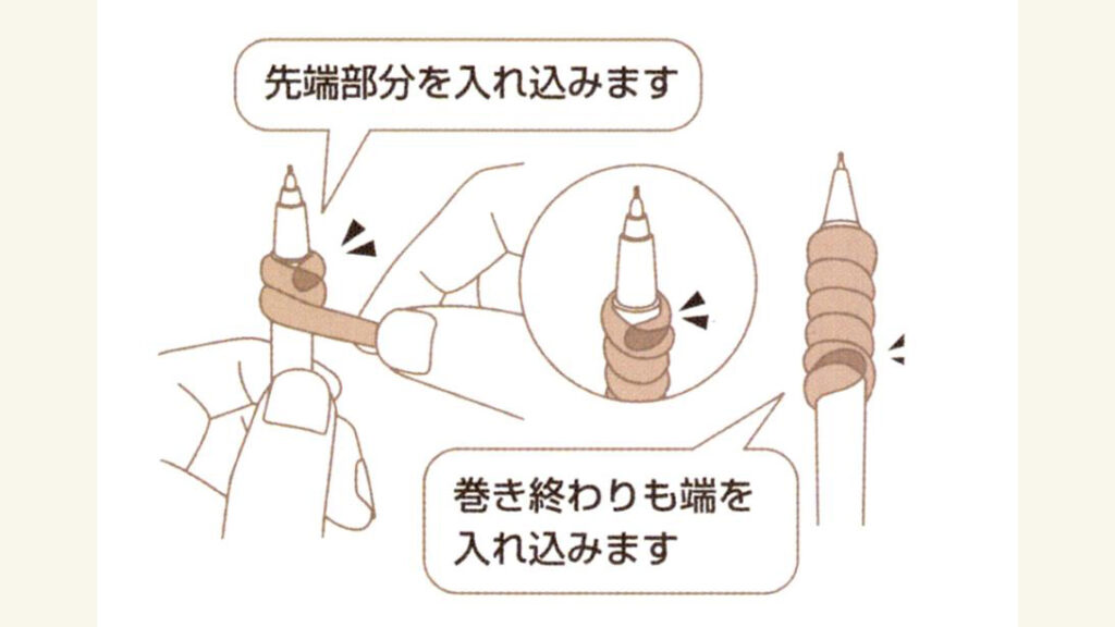 装着の仕方は本当に簡単で、ペンにくるっと巻いて押し込むだけ。力もいらず、誰でもすぐに付け替えられる手軽さが魅力です。