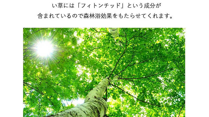 これは、合成芳香剤では絶対に出せない、い草そのものが持つリラックス成分「フィトンチッド」によるもの。